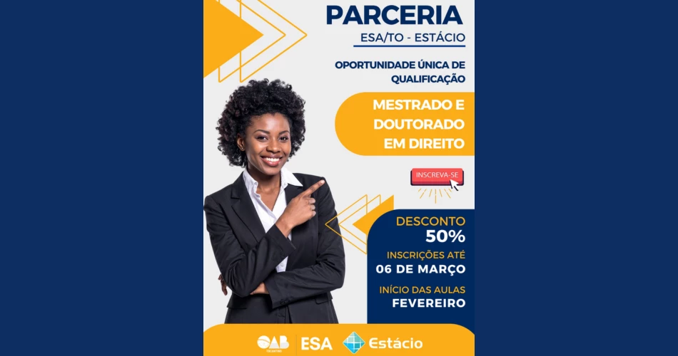 A iniciativa garante 50% de desconto para advogados e advogadas regularmente inscritos na OAB/TO que desejam ingressar nos cursos de Mestrado e Doutorado em Direito, conforme os editais vigentes para o período 2026.1.