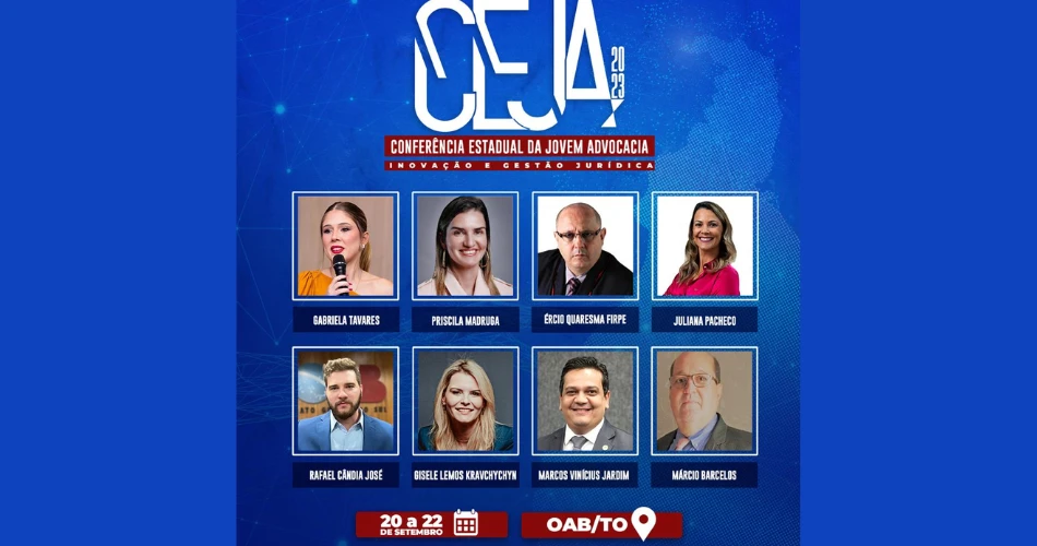A Ordem dos Advogados do Brasil – Seccional Tocantins promove, nos próximos dias 20, 21 e 22, em Palmas, a Conferência Estadual da Jovem Advocacia 2023 (CEJA). O evento será realizado no Palácio da Cidadania, sede da OAB/TO, com a participação de 8 palestrantes de renome nacional para debater o tema deste ano, “Inovação e Gestão Jurídica”.